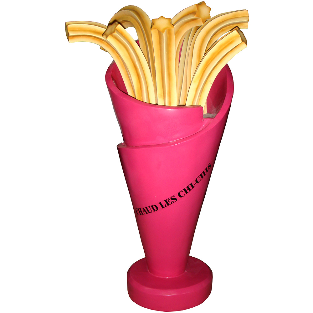 WYKONANIE MATERIAŁ:Obiekt reklamowy w postaci małej makiety Frytek wykonany z laminatu szklanego PWS, gdzie nośnikiem są warstwy włókna szklanego a lepiszczem tiksotropowa żywica poliestrowa.
