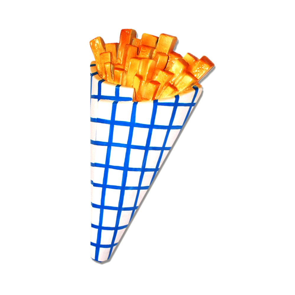WYKONANIE MATERIAŁ:Obiekt reklamowy w postaci wiszącej makiety Frytek wykonany z laminatu szklanego PWS, gdzie nośnikiem są warstwy włókna szklanego a lepiszczem tiksotropowa żywica poliestrowa.