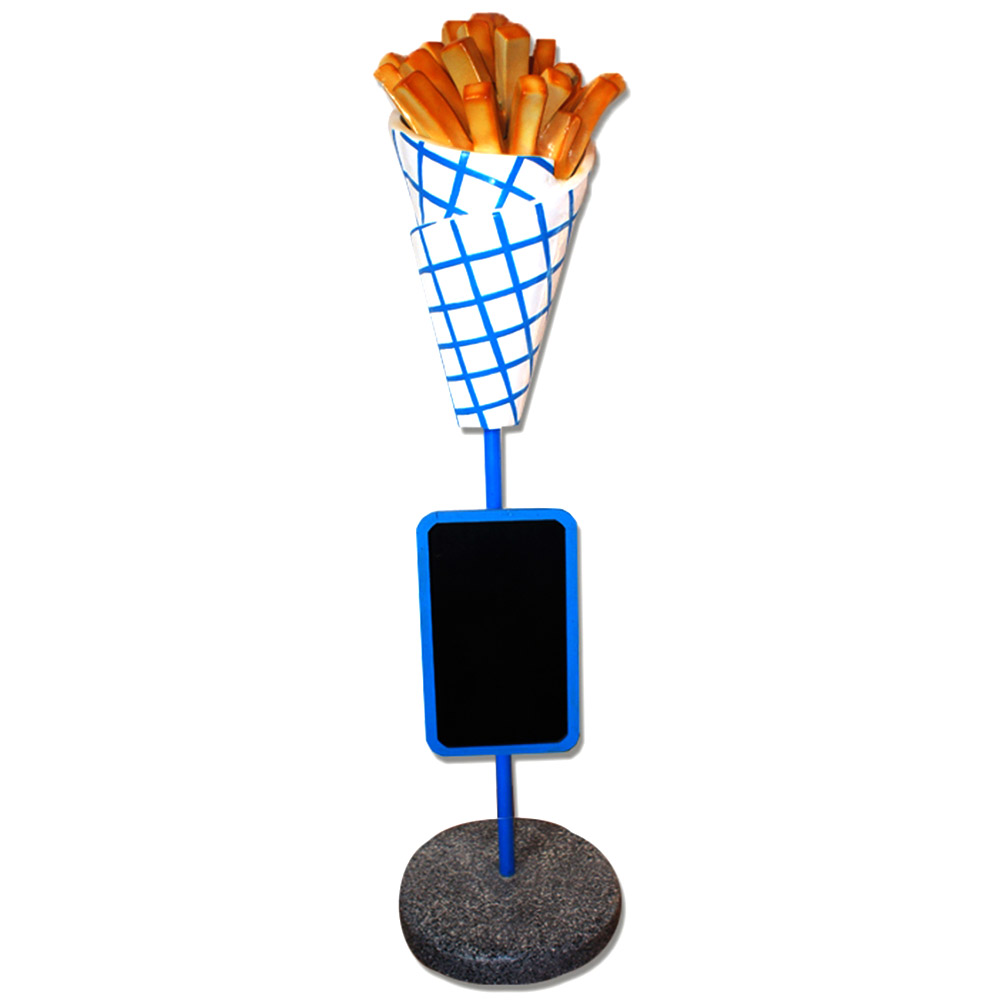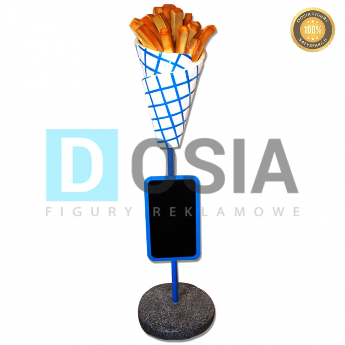 WYKONANIE MATERIAŁ:Obiekt reklamowy w postaci dużej makiety Frytek z tablicą wykonany z laminatu szklanego PWS, gdzie nośnikiem są warstwy włókna szklanego a lepiszczem tiksotropowa żywica poliestrowa.