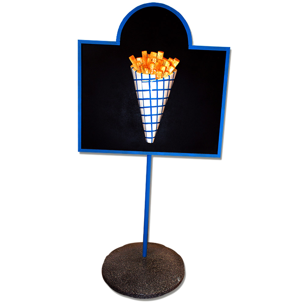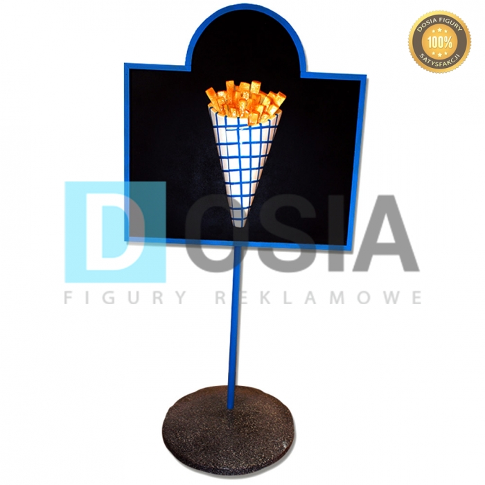 WYKONANIE MATERIAŁ:Obiekt reklamowy w postaci tablicy na stojaku z frytkami wykonany z laminatu szklanego PWS w połączeniu z drewnem, gdzie nośnikiem są warstwy włókna szklanego a lepiszczem tiksotropowa żywica poliestrowa.