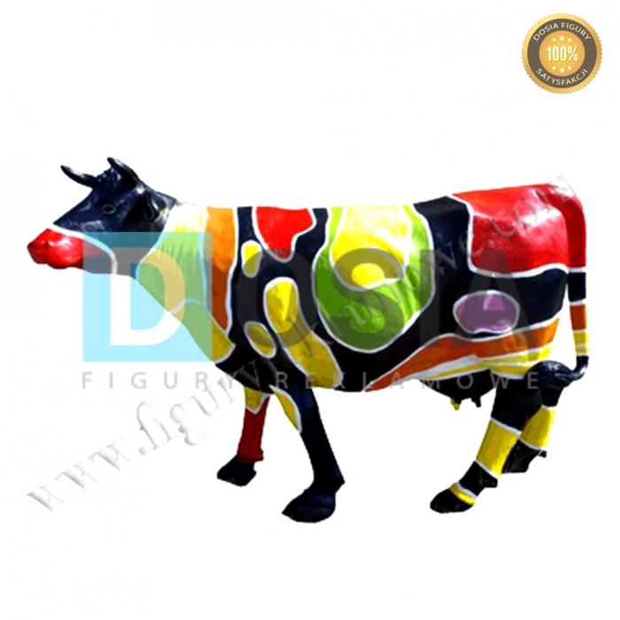 Obiekt reklamowy w postaci dużej makiety KROWY MALOWANEJ NA ŻYCZENIE KLIENTA wykonany z laminatu szklanego PWS, gdzie nośnikiem są warstwy włókna szklanego a lepiszczem tiksotropowa żywica poliestrowa.