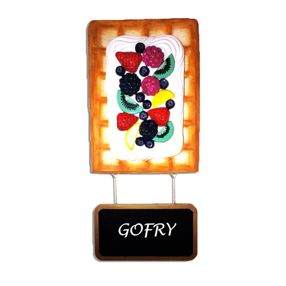 WYKONANIE MATERIAŁ:Obiekt reklamowy w postaci makiety Gofra wiszącego z tablicą menu wykonany z laminatu szklanego PWS, gdzie nośnikiem są warstwy włókna szklanego a lepiszczem tiksotropowa żywica poliestrowa.