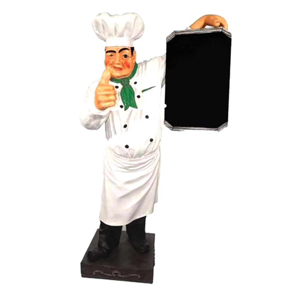 WYKONANIE MATERIAŁ:Obiekt reklamowy w postaci makiety Kucharza z tablicą menu .Figura wykona z laminatu szklanego PWS, gdzie nośnikiem są warstwy włókna szklanego a lepiszczem tiksotropowa żywica poliestrowa.