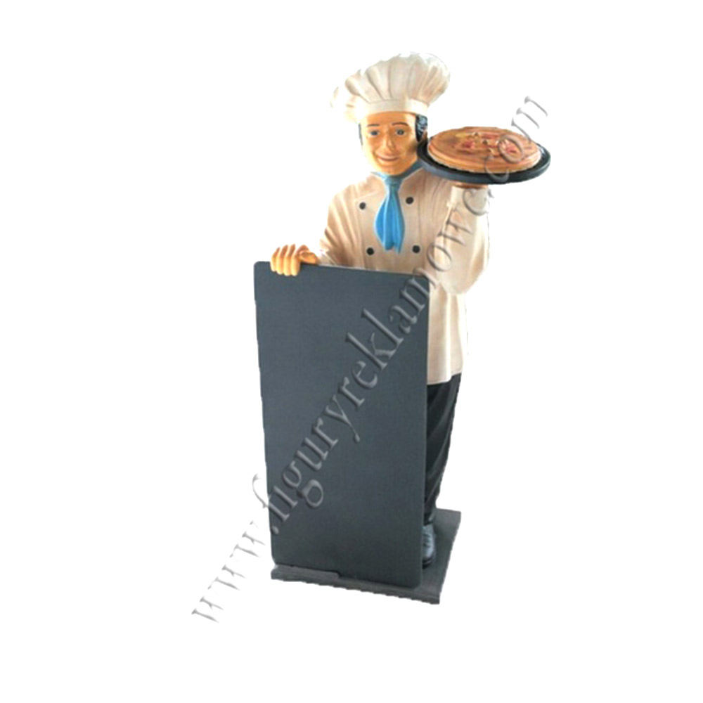 WYKONANIE MATERIAŁ:Obiekt reklamowy w postaci makiety Pizzerman z tablicą do promowania produktów dnia. Figura wykona z laminatu szklanego PWS, gdzie nośnikiem są warstwy włókna szklanego a lepiszczem tiksotropowa żywica poliestrowa.