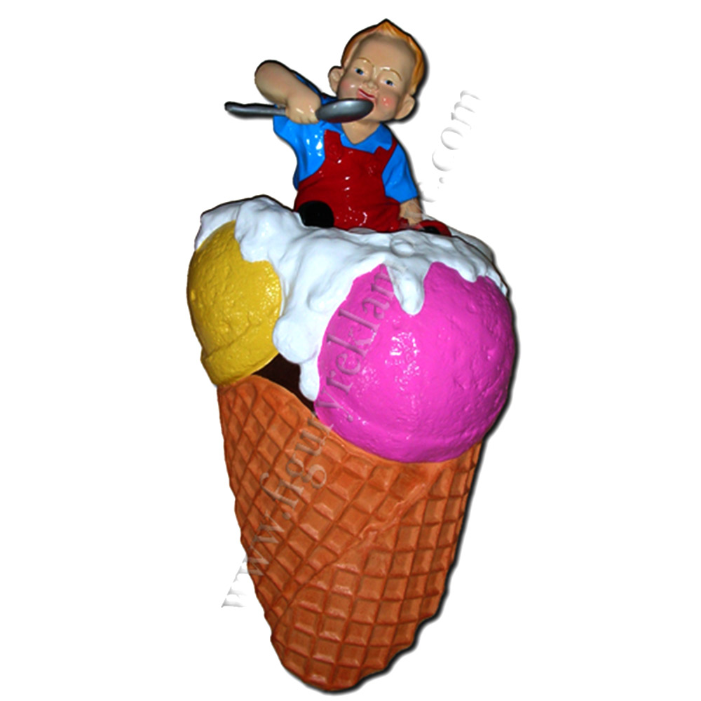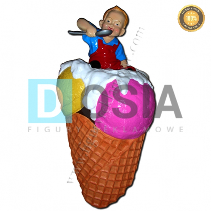 MATERIAŁ:Obiekt reklamowy w postaci makiety dziecka z lodem przystosowanego do zawieszenia na ścisnie wykonany z laminatu szklanego PWS, gdzie nośnikiem są warstwy włókna szklanego a lepiszczem tiksotropowa żywica poliestrowa.