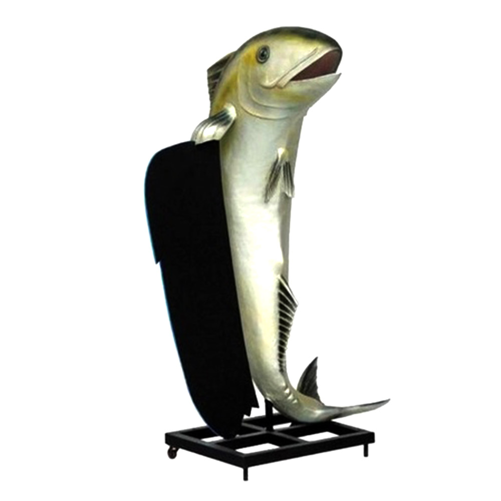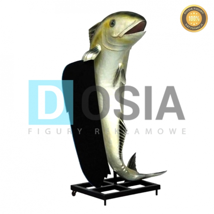 WYKONANIE MATERIAŁ:Obiekt reklamowy w postaci dużej makiety ryby z tablicą menu wykonany z laminatu szklanego PWS, gdzie nośnikiem są warstwy włókna szklanego a lepiszczem tiksotropowa żywica poliestrowa.